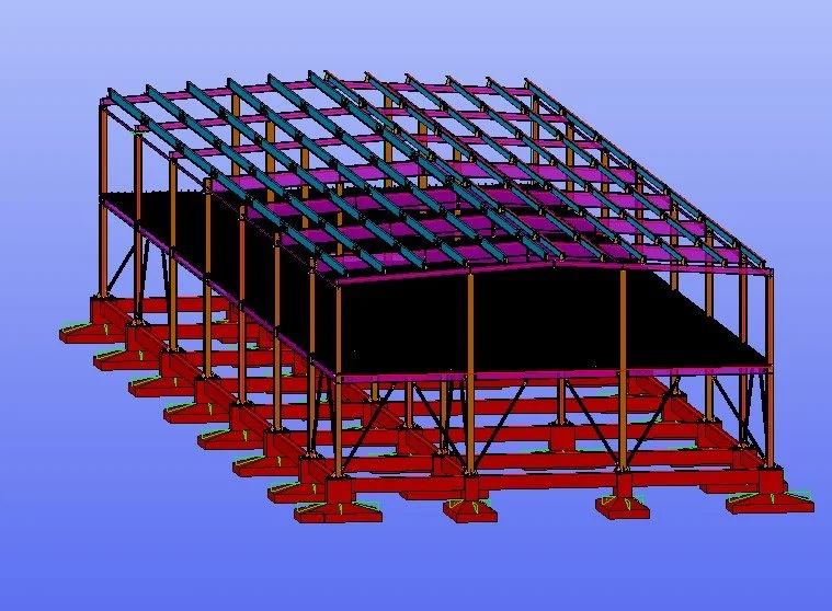 We delivered the technical steel design for a multi-story building in Florești, Cluj County, incorporating portal frames with a 15.15-meter span across two floors. The design features pad foundations interconnected with elastic beams and 7 evenly spaced openings at 6 meters apart, ensuring both structural integrity and efficient space distribution.